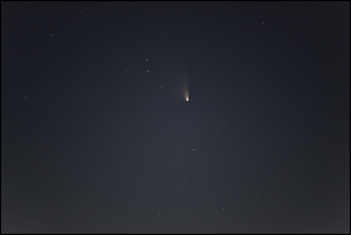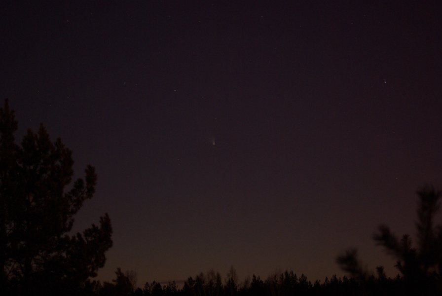 Tõesti-tõesti, 16. märtsil oli taevas väga selge ja komeet oma udususega oli palja silmaga selgelt nähtav. Vaatluse teostasin tagasiteel Tartust Tallinnasse enne seda silda, mis üle Emajõe viib. Seejärel keerasin teisel pool silda paremale, et suurest teest veidi kõrvale saada ja sain statiivil fotoaparaadiga sellise pildi: