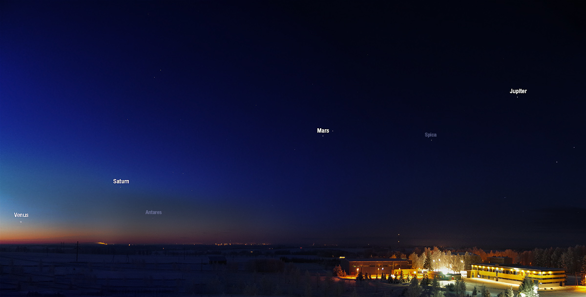 Pilt tehtud Lähtel vaateplatvormilt tund aega enne päikesetõusu. Termomeeter näitas -26 kraadi külma. Merkuur jäi napilt pildist välja, taustal näha Tartut kumamas.